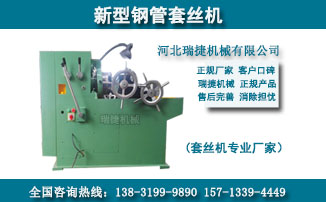 瑞捷套丝机设备采用液压装置成功解决劳动强度大,效率低,且无定位装置,丝扣长短难控制等弊端,可一次型完成螺纹加工成型且螺纹牙形饱满光滑。套丝机的主要部件及结构是由套丝机床的传动系统,支架系统,切线板牙头,定位装置及液压系统组成,工作时只要将工件装入夹钳,其余程序将自动完成,操作简单,通俗易懂,瑞捷套丝机厂家直销,质量有保证,减少不必要的中间环节,为客户带来实实在在的优惠政策,欢迎新老客户洽谈合作事宜和来电咨询.